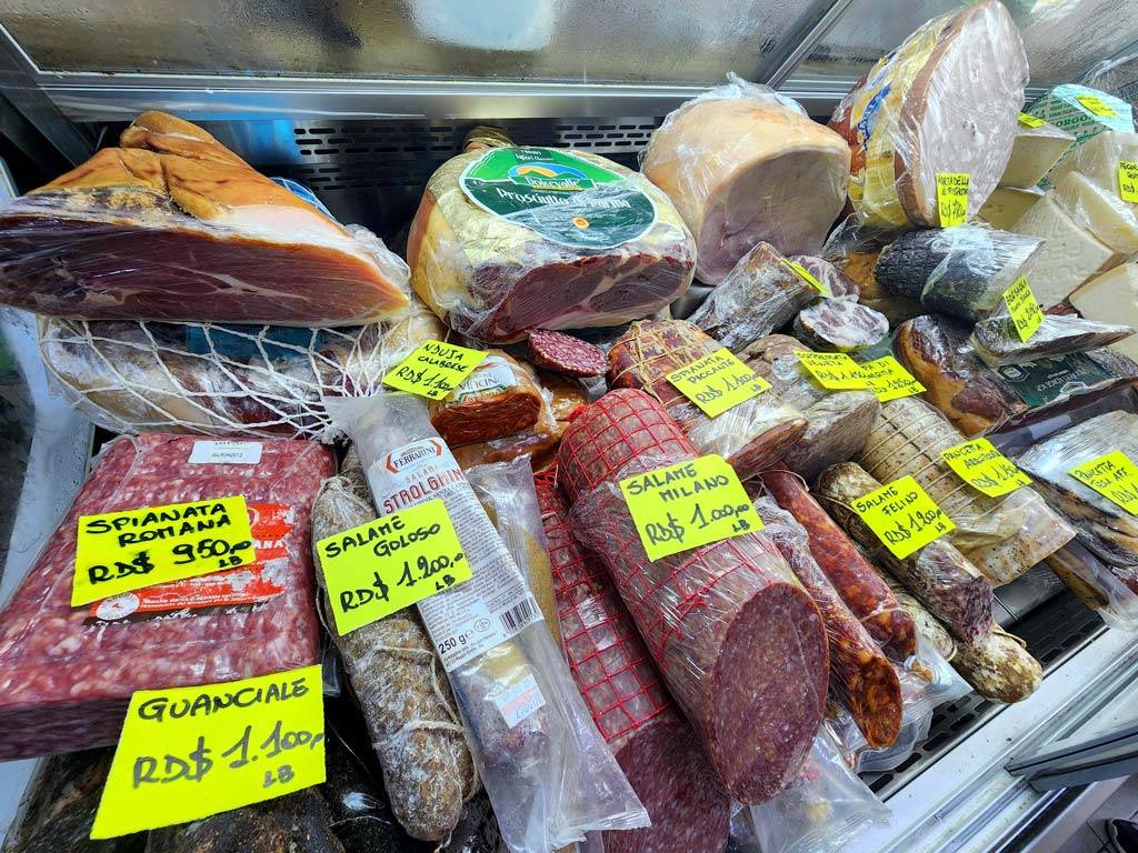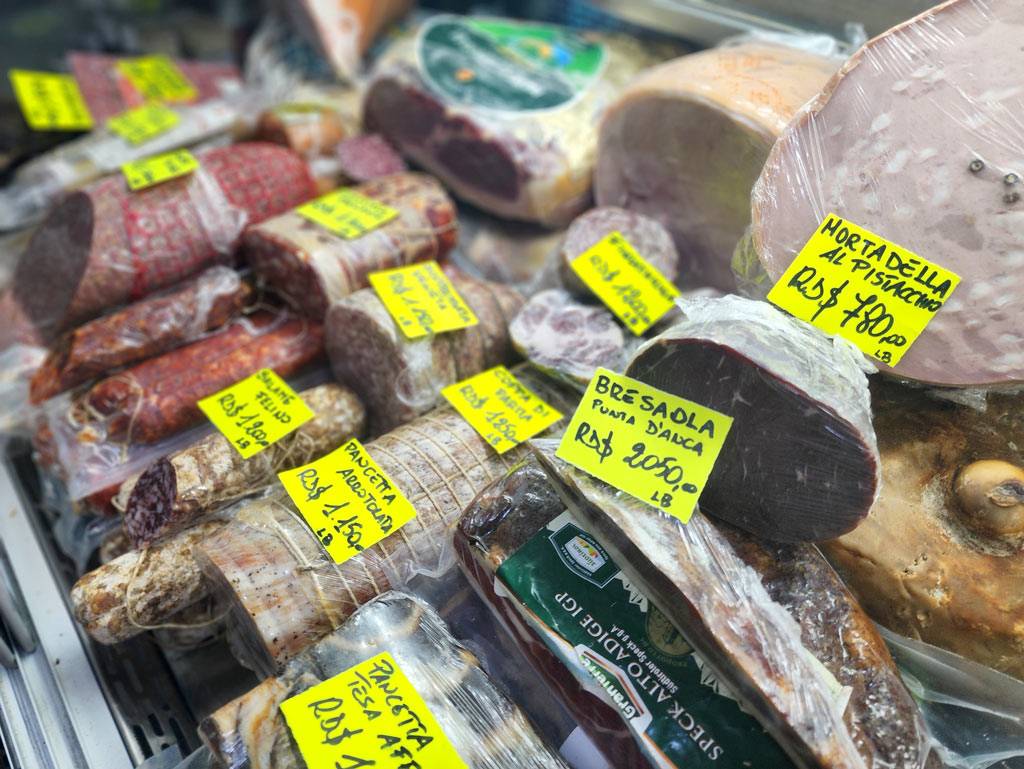 – Embutidos importados: jamón de Parma (24 meses), San Daniele, prosciutto nostrano, además de una gran variedad de salamis (Milano, piccante, Felino, soppressata veneta…), mortadela, coppa, guanciale, pancetta, speck, bresaola… Una selección excepcional, digna de una verdadera salumeria italiana.