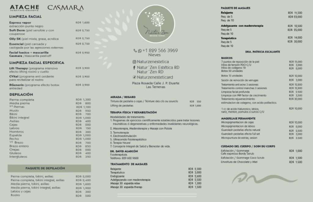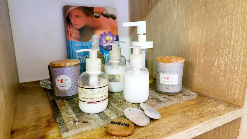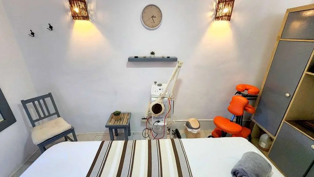 Natur’Zen consta con dos salas de tratamiento y una ducha Italiana. Y utiliza gamas de productos españoles, cosméticos como Casmara y productos dermatológicos como Atache y Genove.