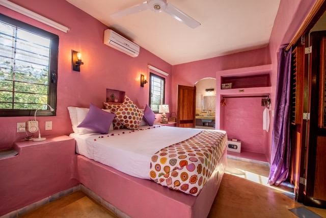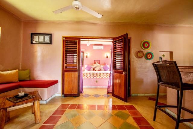 A quelque 150 m de la plage, presque secrète, dissimulée derrière son grand mur pourpre, Eva Luna dans son écrin de verdure est une véritable invite à la relaxation et à l’évasion. Au cœur de la propriété, la piscine aux belles proportions et ses voluptueux coussins vous promet de délicieux moments de détente en toute convivialité. Tout autours, les 5 bungalows et villas se fondent dans la végétation luxuriante mais savamment domptée, assurant aux vacanciers une parfaite intimité.  Chaque refuge délicieusement cosy possède son propre univers, décliné dans une véritable symphonie de couleurs toniques, clin d’œil aux somptueux riads marocains. Le cœur balance entre la profondeur hypnotique du bleu Klein, le rouge cramoisi, le vert émeraude, la chaleur de l’orange, le citron acidulé, le rose tyrien ou le mauve layette….. C’est avec l’aide de son amie Clarisse (https://dorislasterrenas.com/2016/08/31/taller-design-une-decoratrice-de-charme-aux-talents-eclectiques/), décoratrice d’intérieur, qu’Aude a opté avec audace pour cette palette de tons chaleureux peu ordinaires et affirmé l’identité de son havre de paix par une déco sobre, axée essentiellement sur l’harmonie des couleurs et se mariant extraordinairement bien avec la noblesse authentique des matériaux. Parfaitement équipés, bungalows ou villas possèdent tous une ravissante petite cuisine pour des repas gourmands sur leur belle terrasse ombragée, celle-là même où est servi chaque matin un succulent petit déjeuner. A l’image de la maîtresse des lieux, discrétion, sérénité et raffinement confèrent à Eva Luna une atmosphère unique, un véritable art de vivre idéal pour se ressourcer, à deux pas de tout mais préservé du pire. D’ailleurs, les grands magazines français comme Le Figaro, Le Point…. et même le prestigieux New York Times ne s’y sont pas trompés, encensant dans leurs chroniques le charme tranquille de ce refuge douillet presque confidentiel.