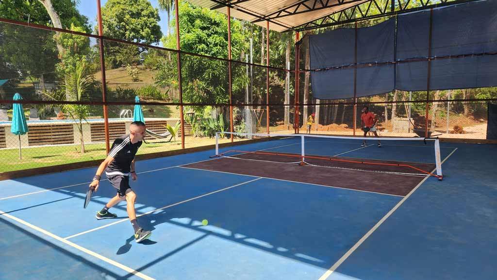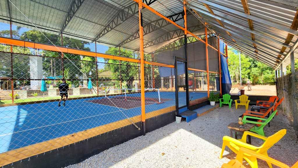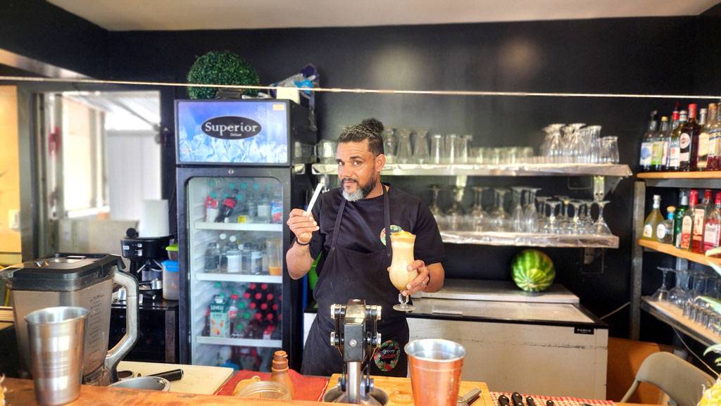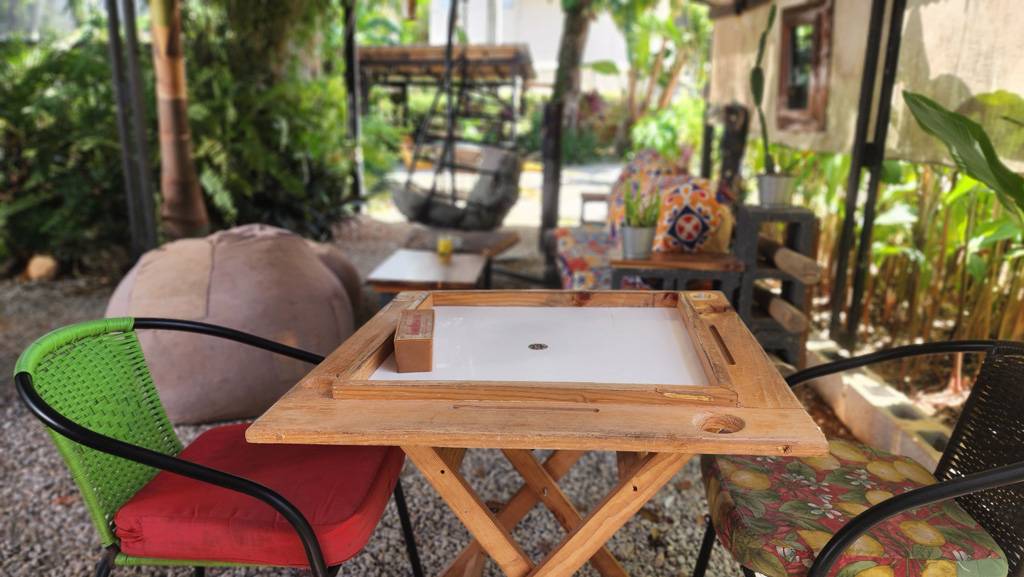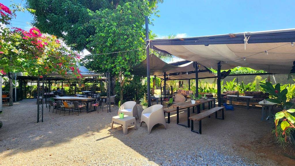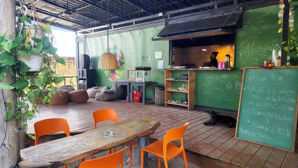 C’est un beau jardin, avec des tables, des hamacs, des jeux pour enfants, une connexion Wi-Fi, des canapés, un parking et en arrière-plan un conteneur de 45 pieds où il fait sa magie. C’est là que sont préparés les plats, les jus de fruits faits maison et différents et les autres boissons que vous souhaitez commander.