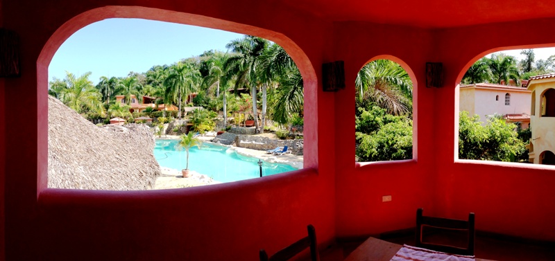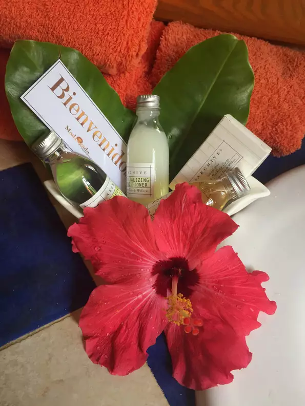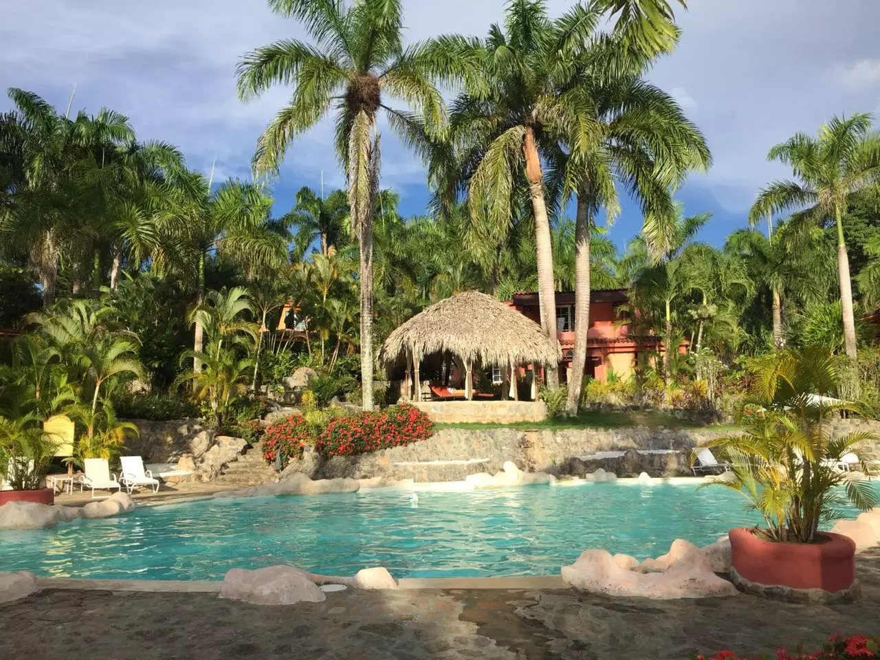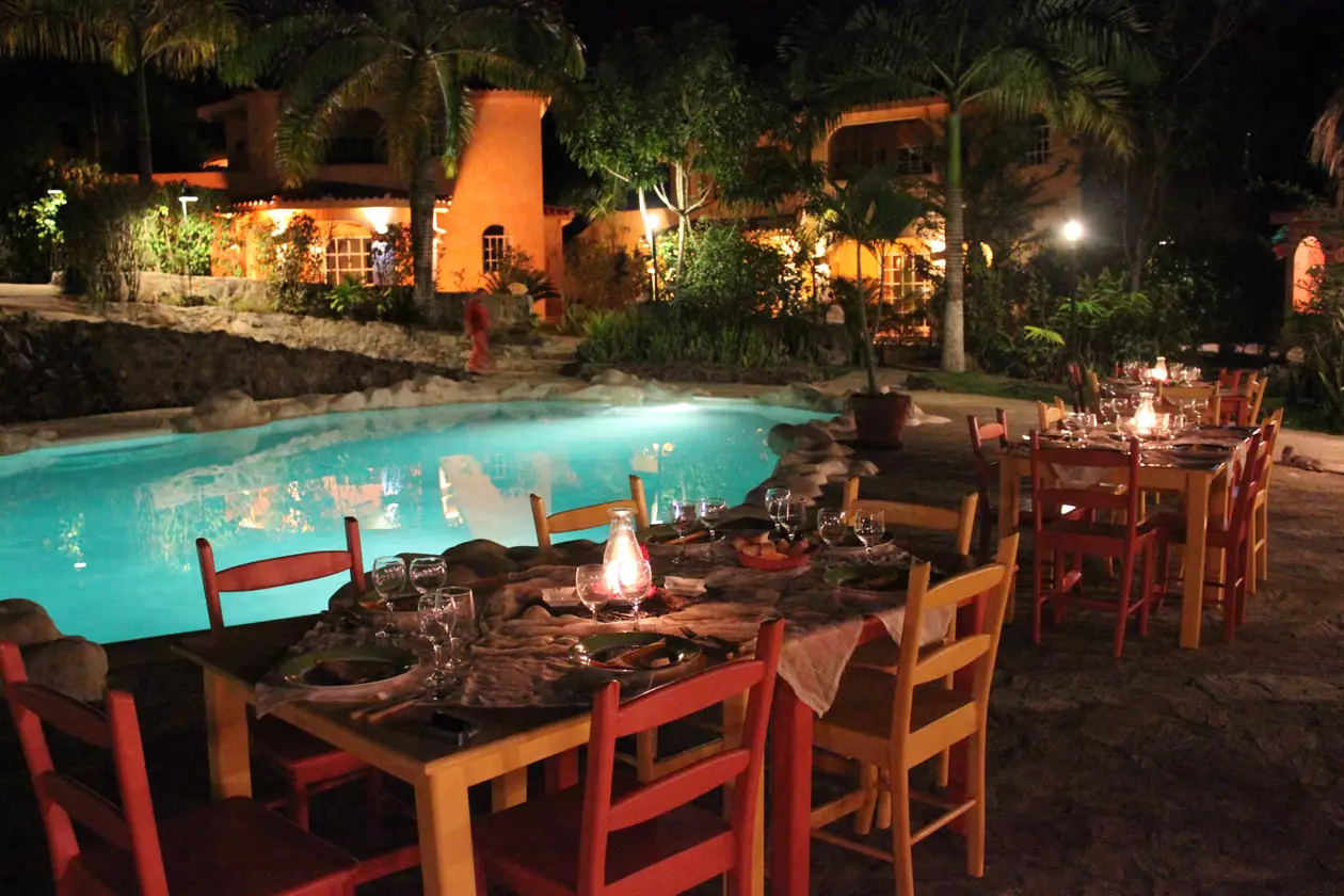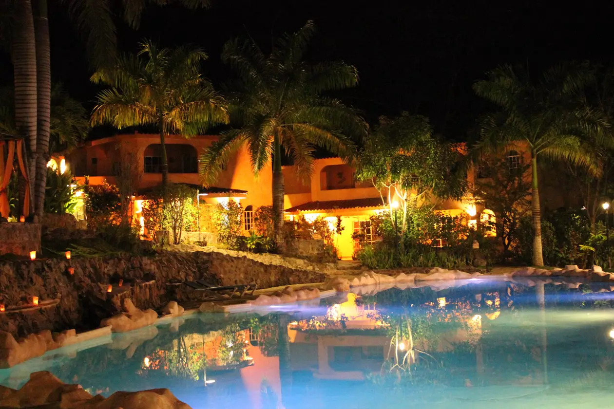 Recepción, bar y restaurante, entre techados de naturaleza que se reflejan en la maravillosa piscina y el jacuzzi, como si fuera un ángulo de mar entre palmeras, rocas y un romántico juegos de luces en la piscina.