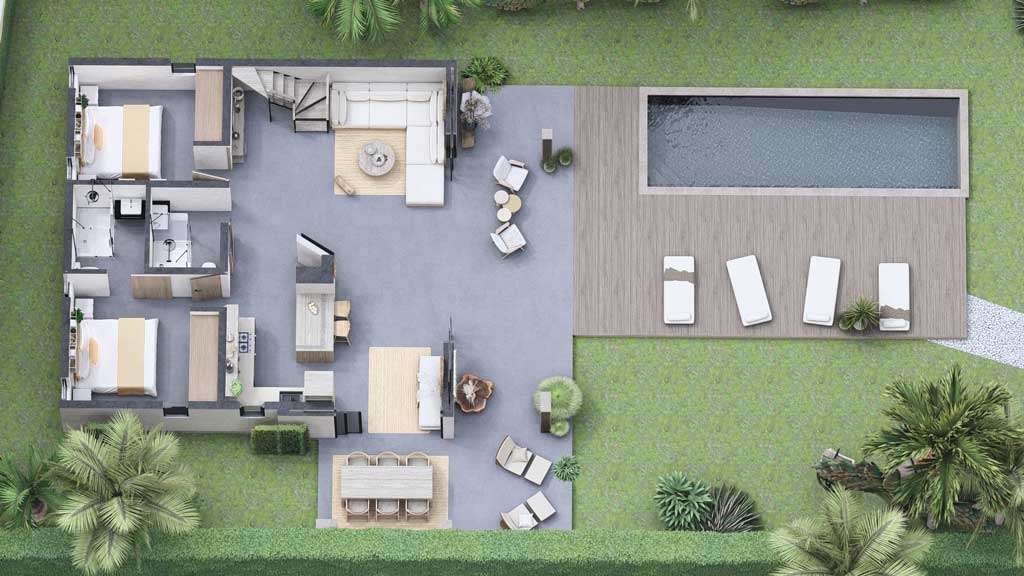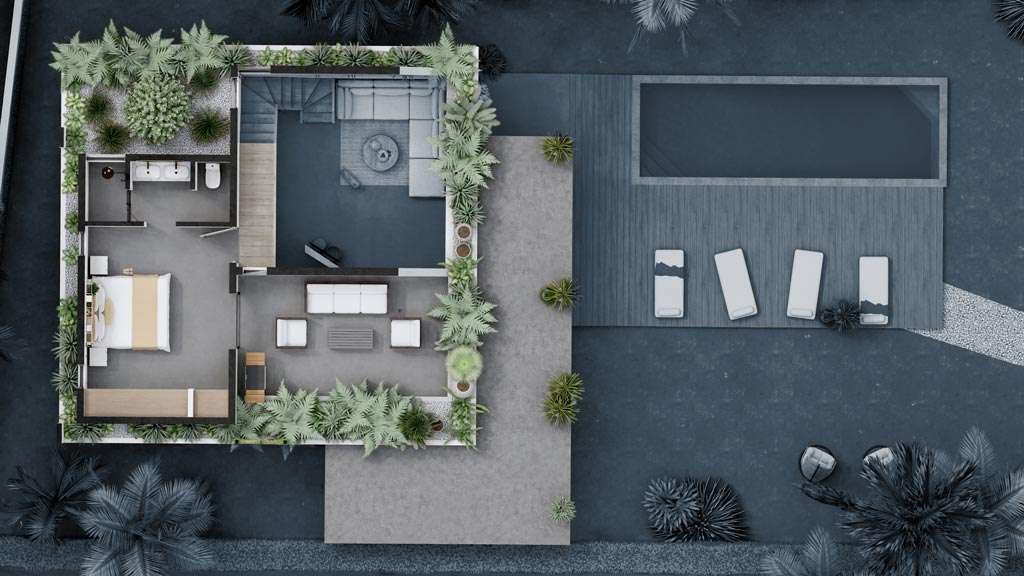 Cada villa esta construida en un terreno de 600m² y cuenta con tres habitaciones, una piscina privada, un jardín de 400 metros cuadrados y un área de estacionamiento para 4 vehiculos (1 cubierto), ofreciendo privacidad y confort a sus residentes, entre otras areas, teniendo un total de construcción de 272 metros cuadrados.