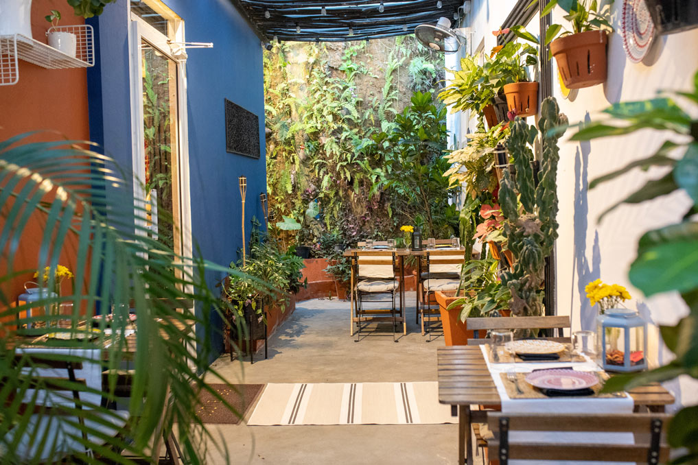 Aquí, cada plato cuenta una historia, y cada detalle importa — desde un menú refinado y sorprendente hasta la atmósfera serena de los patios llenos de plantas, acompañados por suaves notas de jazz.