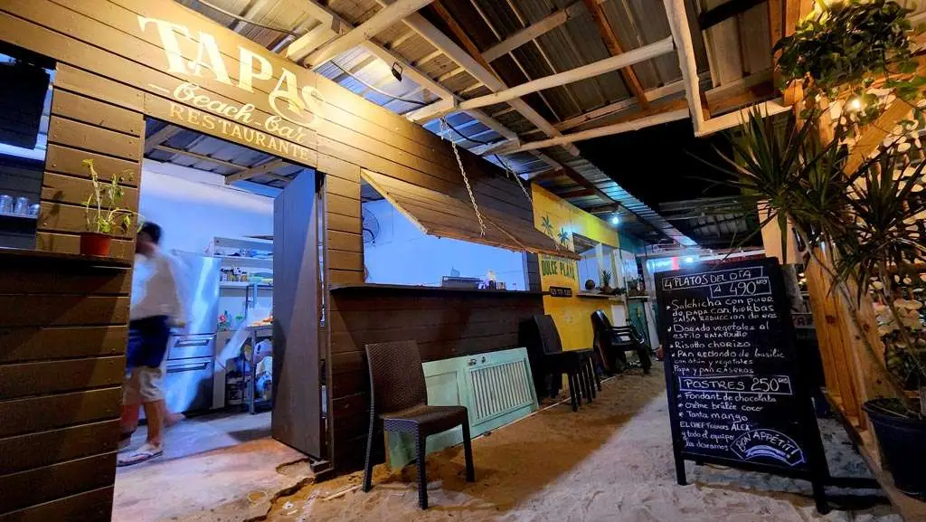 TAPAS BEACH se encuentra en el barrio de los pescadores, detrás del cementerio. Se accede por la heladería, el cuarto restaurante después de Dulce Playa.